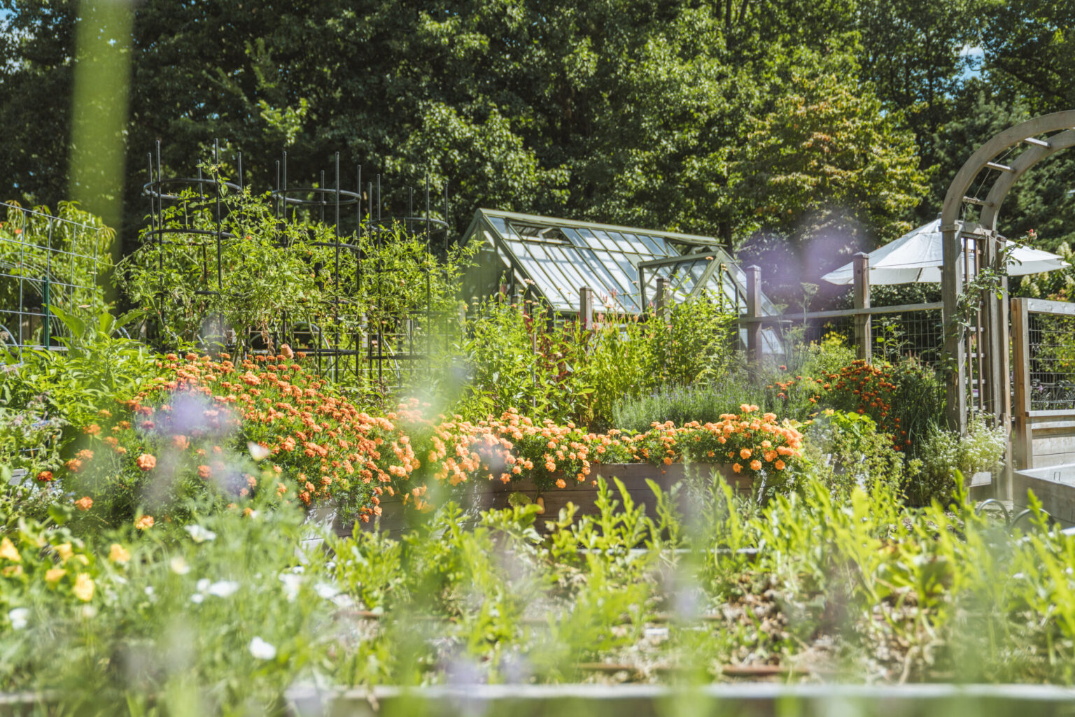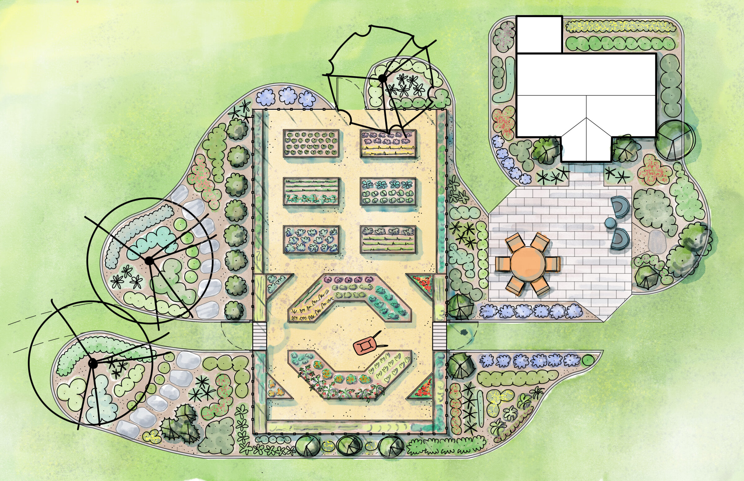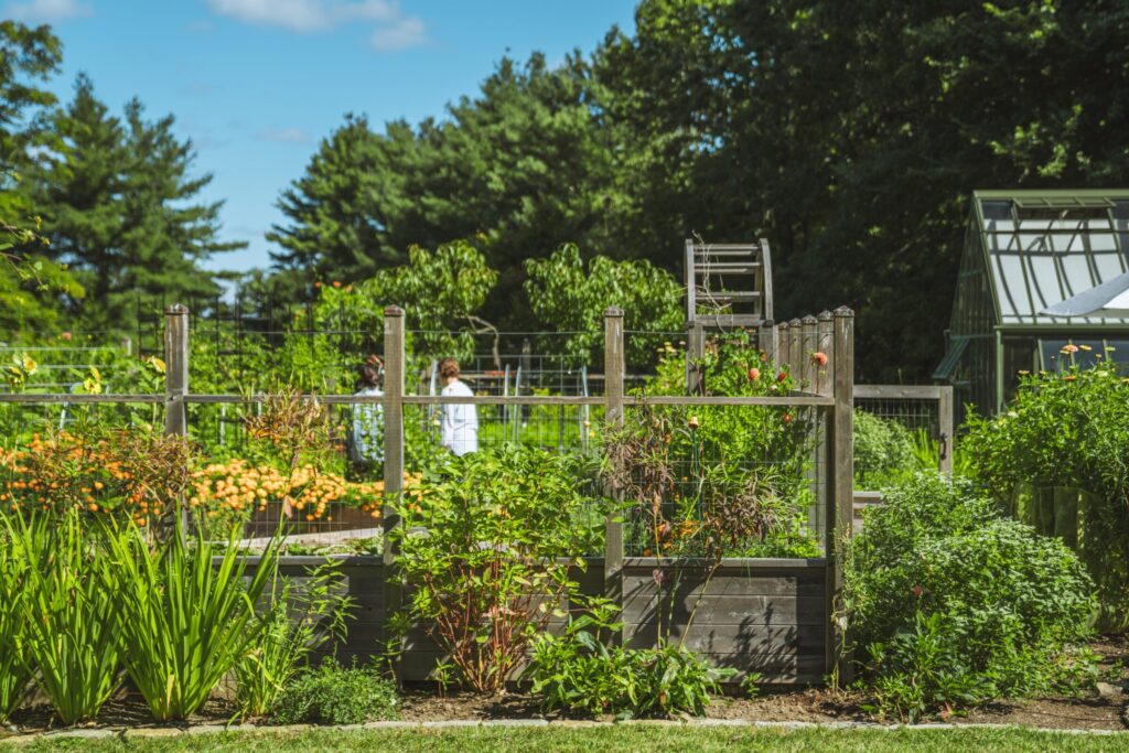 - Potager-inspired kitchen garden with 11 raised beds (525 SF growing space)