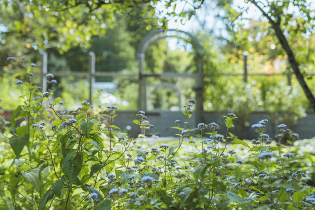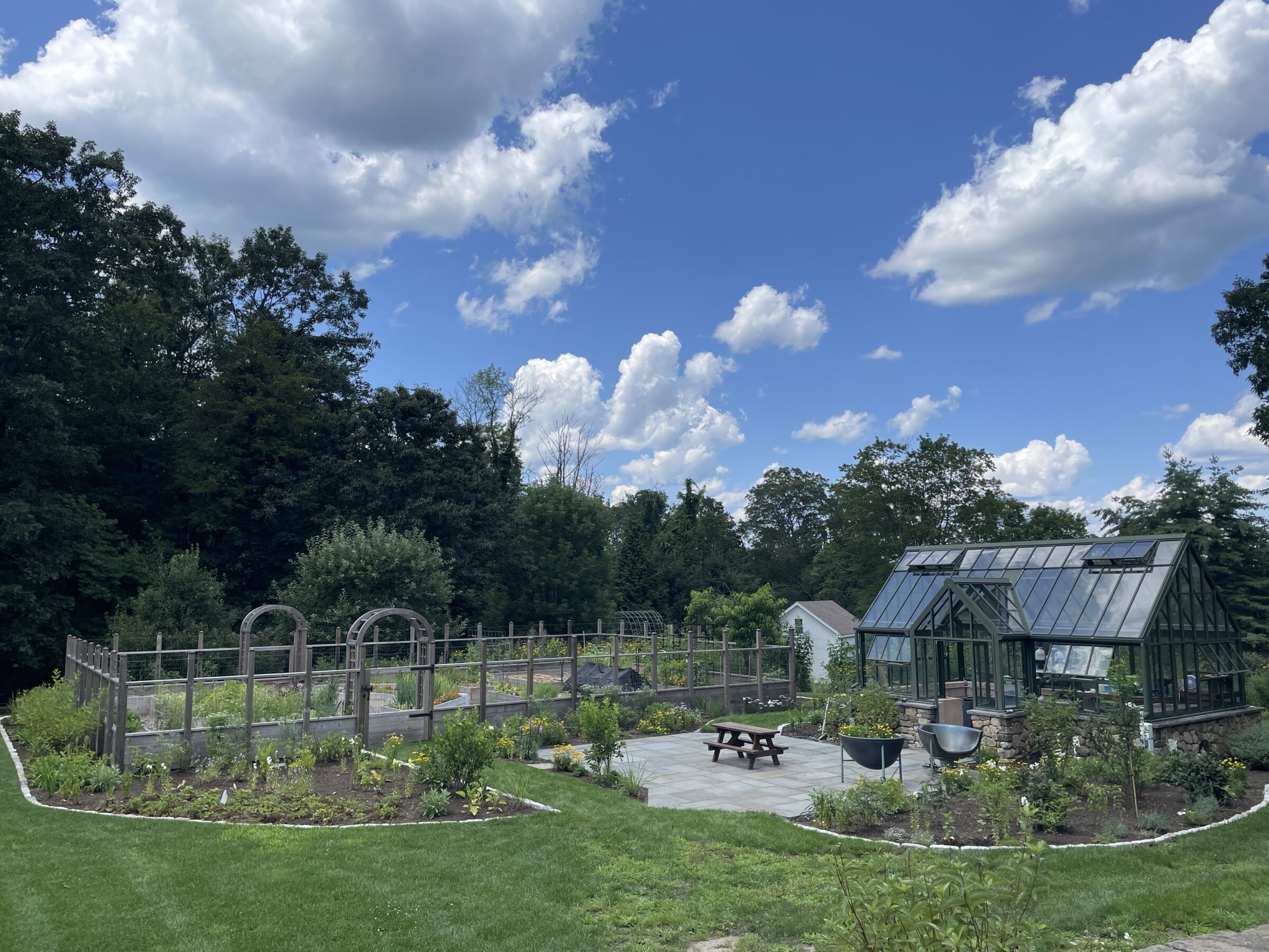 RDG designed a potager-inspired kitchen garden with 11 raised beds, enclosed by a cedar-and-mesh fence with crafted arched gateways that double as vertical trellises for climbing crops. The garden links seamlessly to the greenhouse via a bluestone patio, while surrounding beds integrate edible perennials like rhubarb and asparagus with pollinator-friendly natives such as fall aster, bergamot, and butterfly milkweed.